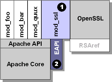 Module ArchitectureThe mod_ssl package consists of the SSL module (part 1 in Figure 1) and a set of source patches for Apache adding the Extended API (EAPI) (part 2 in Figure 1) which is an essential prerequisite in order to use mod_ssl. In other words: you can only use the mod_ssl module when Apache's core code contains the Extended API. But because when applying mod_ssl to the Apache source tree the Extended API is also automatically added you usually don't have to think about this. It's mainly important for package vendors who want to build separate packages for Apache and mod_ssl. For more details on how to apply mod_ssl to the Apache source tree please follow theINSTALL file in the mod_ssl